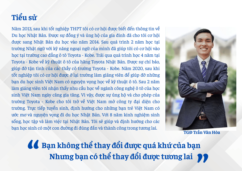 Kobe - Japan tự hào là một trong những công ty tư vấn du học Nhật Bản, đào tạo ngoại ngữ tiếng Nhật hàng đầu Việt Nam, được thành lập và dẫn dắt bởi chuyên viên, giảng viên giàu kinh nghiệm từ Toyota - Kobe. Chúng tôi cũng là đại diện duy nhất của Trường Cao đẳng ô tô Toyota - Kobe, minh chứng cho Giá trị cốt lõi về Chất lượng & Chuyên nghiệp mà chúng tôi cam kết.